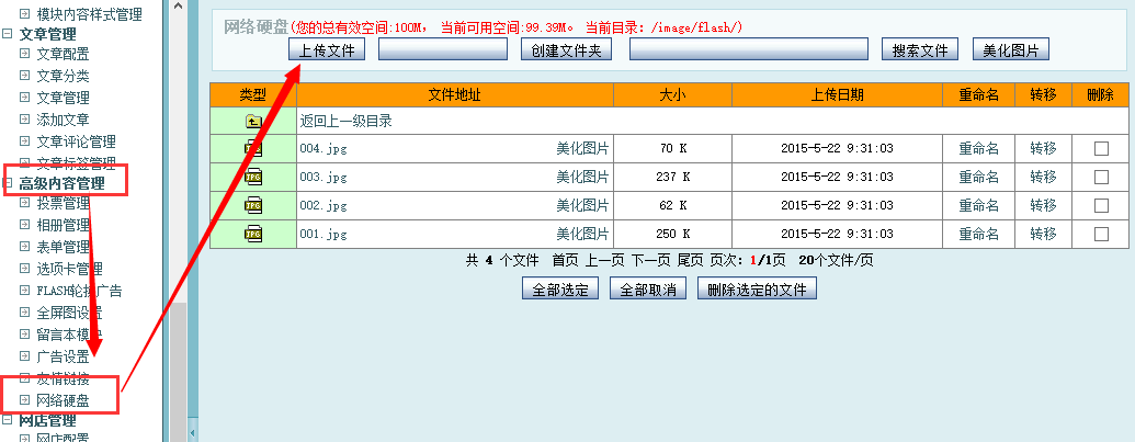 到高级内容管理》网络硬盘中,上传您的图片到网络硬盘,为了方便管理,我们这边在image目录中新建了一个flash的文件夹,用来存放我们的图片,新版本的网络硬盘也是可以批量上传图片的,而且比之前的更加简单,直接在选择文件时按住ctrl选择需要的文件即可,最多一次上传十个文件(小提示:网络硬盘中的文件夹及文件名称尽量不要使用中文和特殊字符,部分时候可能会导致乱码,出现错误)