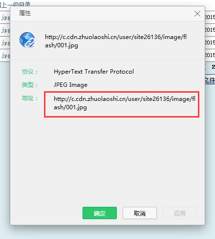 在图片名称上右键》然后选择属性,找到这个图片的链接地址,建议使用相对路径,我们不需要复制前边的域名,只需要复制后边的部分即可  /site26136/image/flash/001.jpg(有些朋友习惯使用中文命名文件,这里会显示成特别长的英文的乱码,可能会显示不全,建议选择是按住鼠标再向下拖动,选择完整的链接)