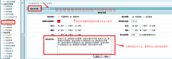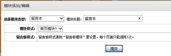 模块调用的方法,首页管理添加模块,调用留言本,如图:
