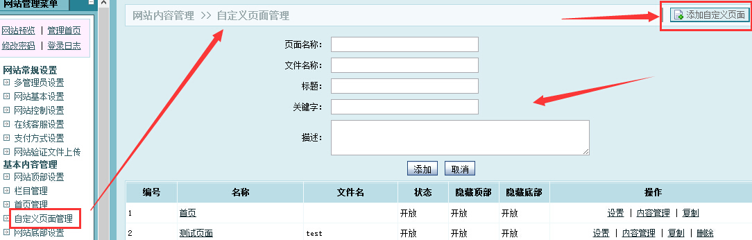 在网站后台》网站基本内容管理》自定义页面管理,右上角添加自定义页面,然后填写好页面名称,描述等相关信息添加即可