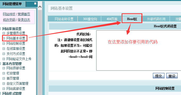 添加方法:登陆网站后台》网站常规设置》网站基本设置中找到head区,将需要添加的代码添加在下边文本框内即可