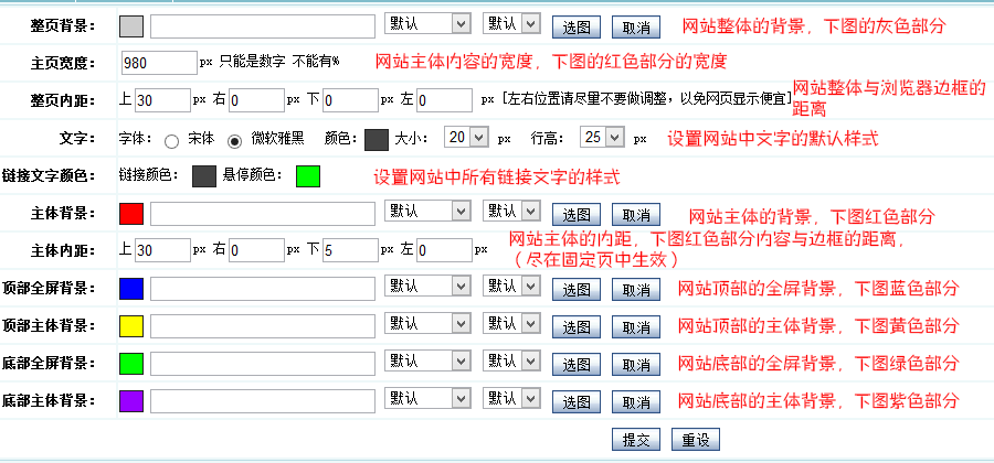 主体内距:设置网站主体的内距,(设置在自定义页面中无效,仅在固定页中生效)