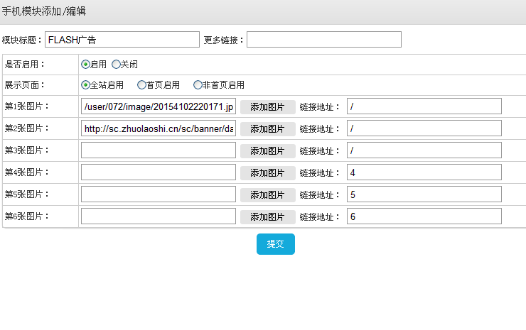 单击需要添加的模块类型,会弹出编辑页面 如图FLASH广告(您在电脑上的网络硬盘里上传您的图片 您在手机网站上调用就可以了 或者直接从本地上传)
